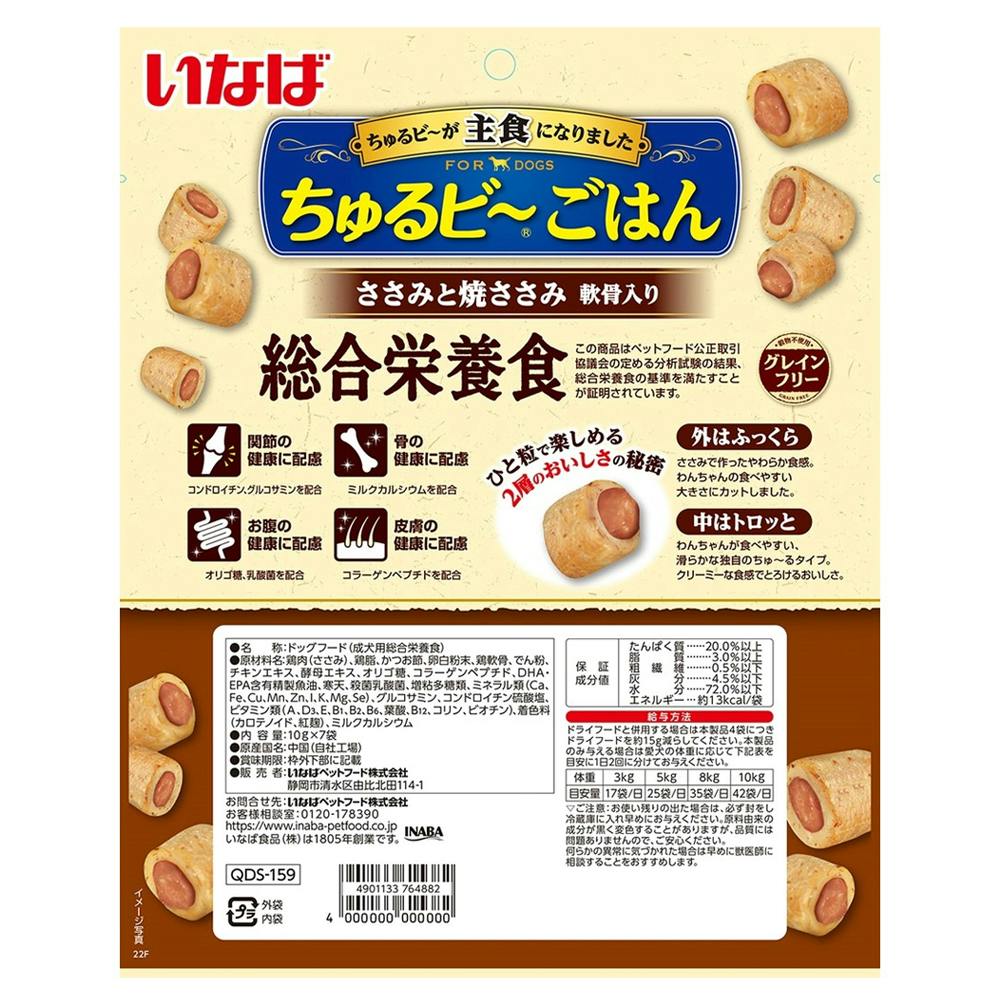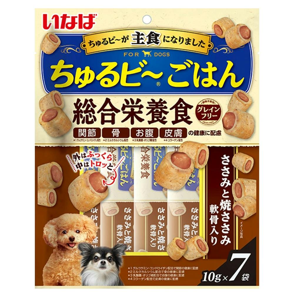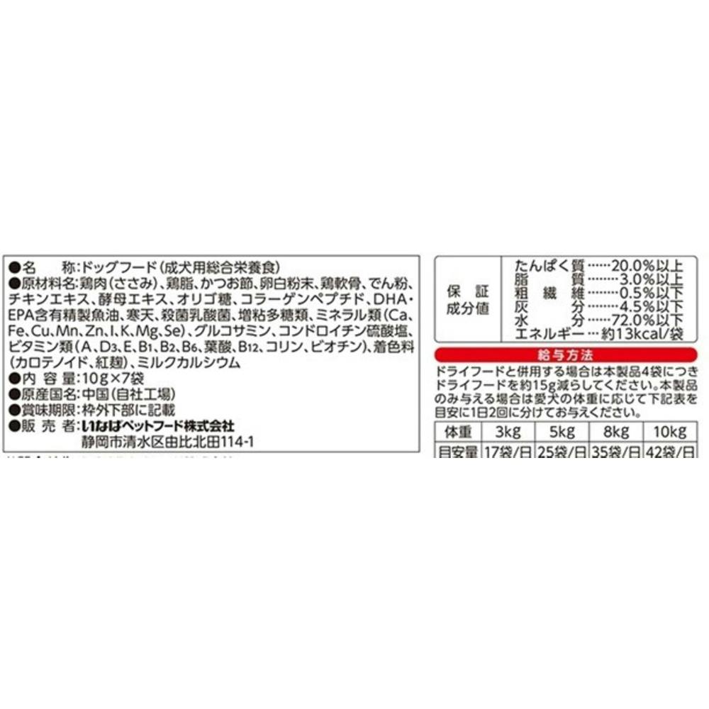 鶏肉(ささみ)、鶏脂、かつお節、卵白粉末、鶏軟骨、でん粉、チキンエキス、酵母エキス、オリゴ糖、コラーゲンペプチド、DHA・EPA含有精製魚油、寒天、殺菌乳酸菌、増粘多糖類、ミネラル類(Ca、Fe、Cu、Mn、Zn、I、K、Mg、Se)、グルコサミン、コンドロイチン硫酸塩、ビタミ