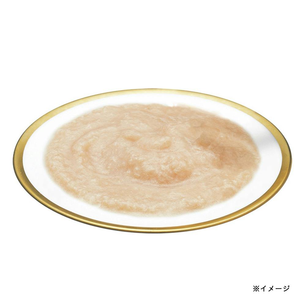 鶏肉(ささみ)、鶏脂、チキンエキス、タンパク加水分解物、オリゴ糖、増粘安定剤(加工でん粉、増粘多糖類)、ミネラル類(Ca、K、Fe、Cu、Mn、Zn、I)、キトサン、ビタミン類(コリン、E、A、D3、B1、葉酸、B12)、紅麹色素、緑茶エキス