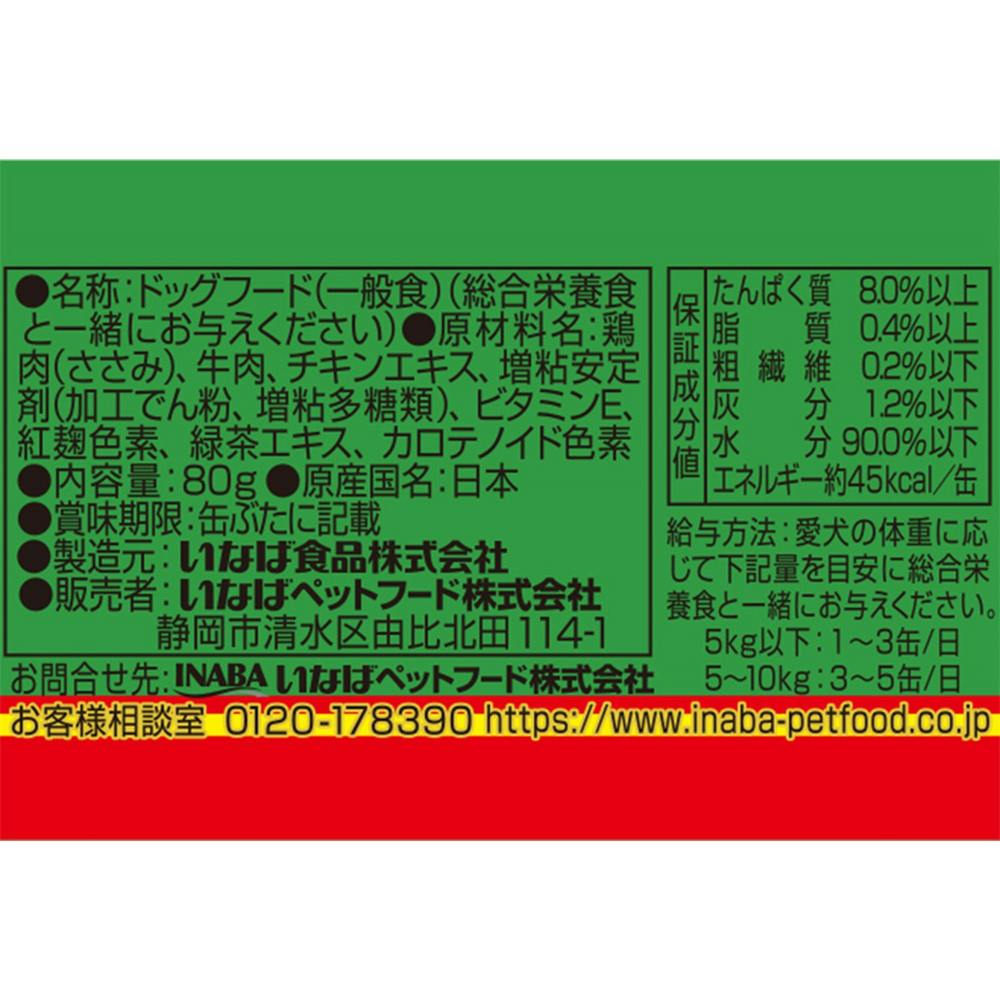 鶏肉(ささみ)、牛肉、チキンエキス、増粘剤(加工でん粉)、増粘多糖類、ビタミンE、紅麹色素、緑茶エキス、カロテノイド色素