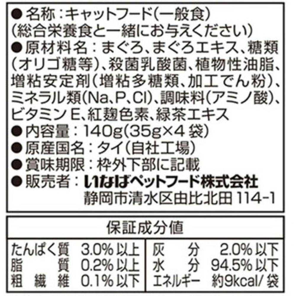 まぐろ、まぐろエキス、糖類(オリゴ糖等)、殺菌乳酸菌、植物性油脂、増粘安定剤(増粘多糖類、加工でん粉)、ミネラル類(Na、P、Cl)、調味料(アミノ酸)、ビタミンE、紅麹色素、緑茶エキス