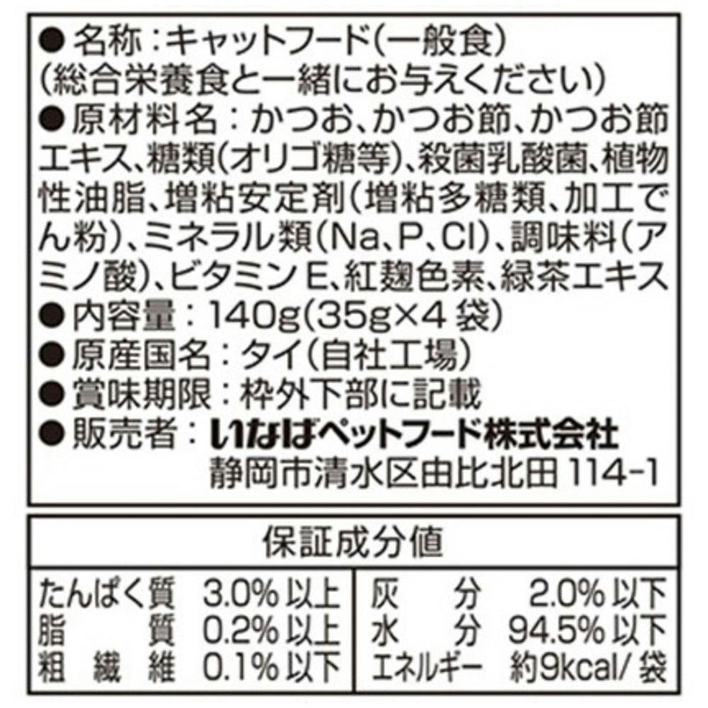 かつお、かつお節、かつお節エキス、糖類(オリゴ糖等)、殺菌乳酸菌、植物性油脂、増粘安定剤(増粘多糖類、加工でん粉)、ミネラル類(Na、P、Cl)、調味料(アミノ酸)、ビタミンE、紅麹色素、緑茶エキス