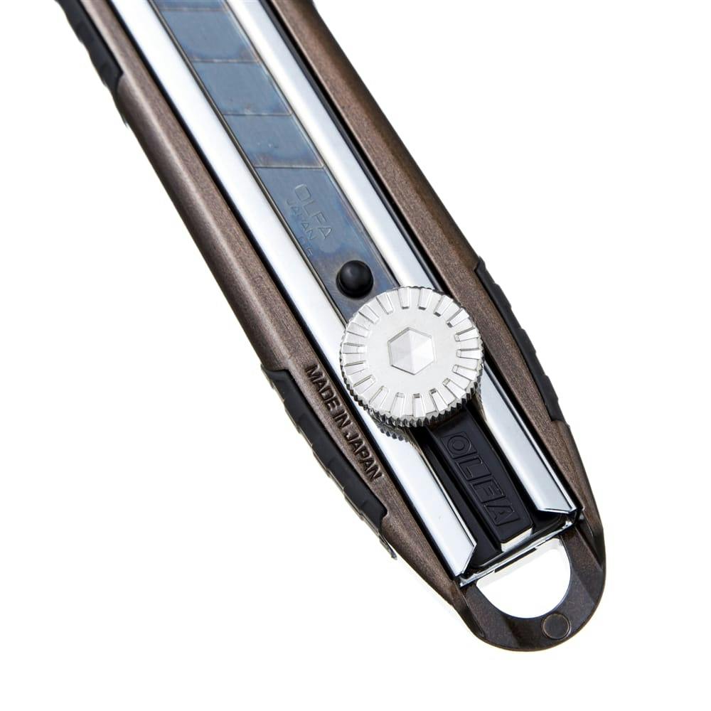 エックスデザインハイパーシリーズのアルミダイキャスト大型カッターナイフ。刃先までしっかり固定できるネジロック式