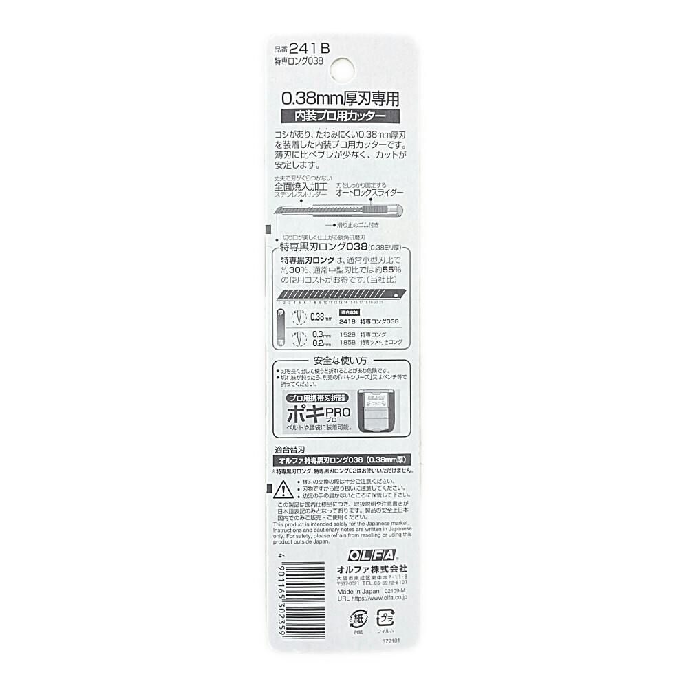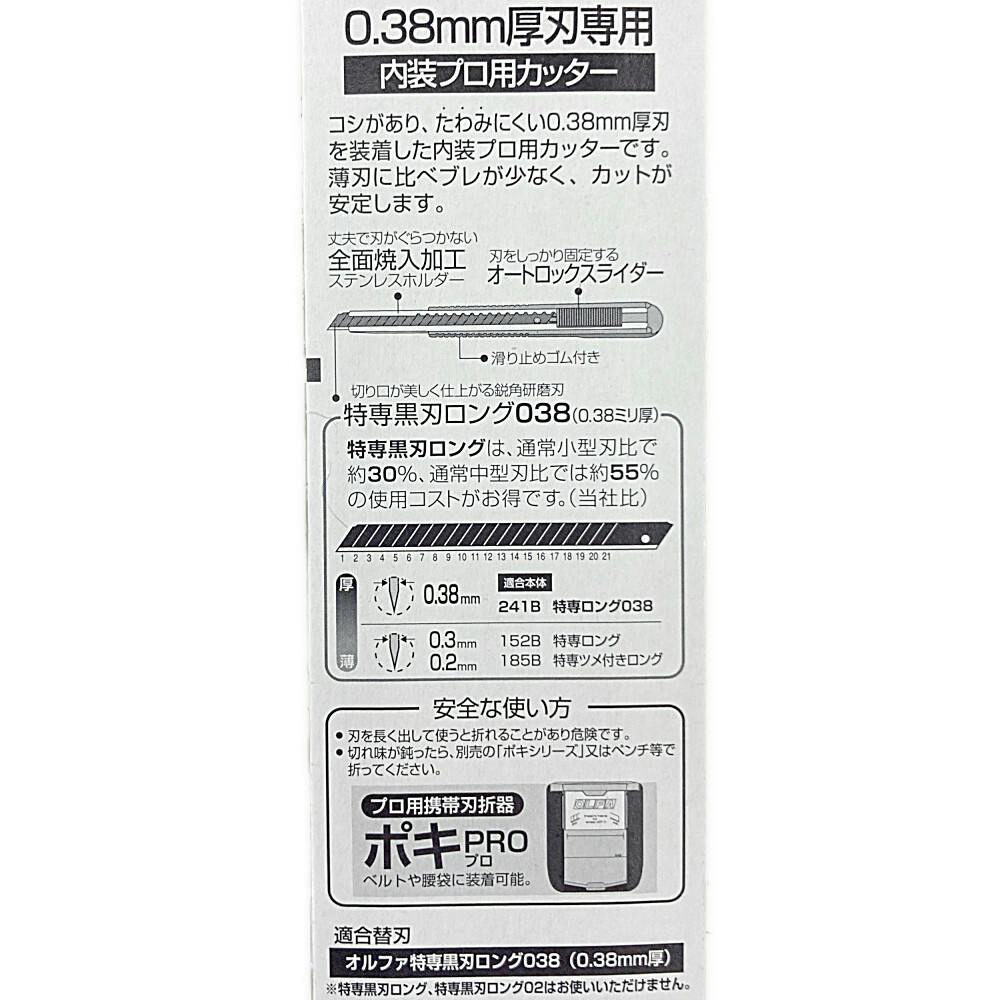 ●壁紙を切ることを目的として開発したプロ用カッターナイフ。 ●1枚で新しい刃先が21回使えてお得な、特専黒刃ロング038を装着したオートロック式小ロング型カッターナイフ。 ●コシがありたわみにくい0.38mm厚の刃は、ブレにくいため安定したカットに適しています。