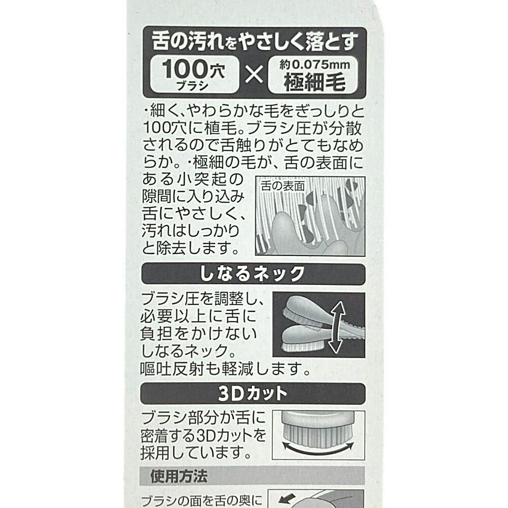 ●息きれい、お口のエチケット ●舌への負担が少ない ●舌にやさしい設計、歯学博士推奨 ●なめらかな舌触りの極細ブラシが、舌にやさしく汚れはしっかり除去