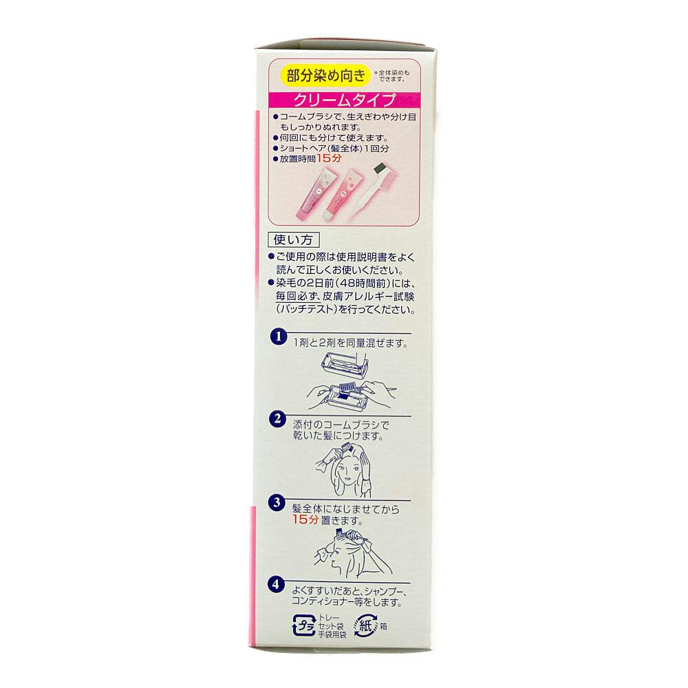●部分染めに強いクリームタイプ ●全体染めにも使えます ●染めにくい根元や短い白髪にもしっかり密着するクリーム ●放置時間15分で根元・生えぎわまで深く染まる早染めタイプ