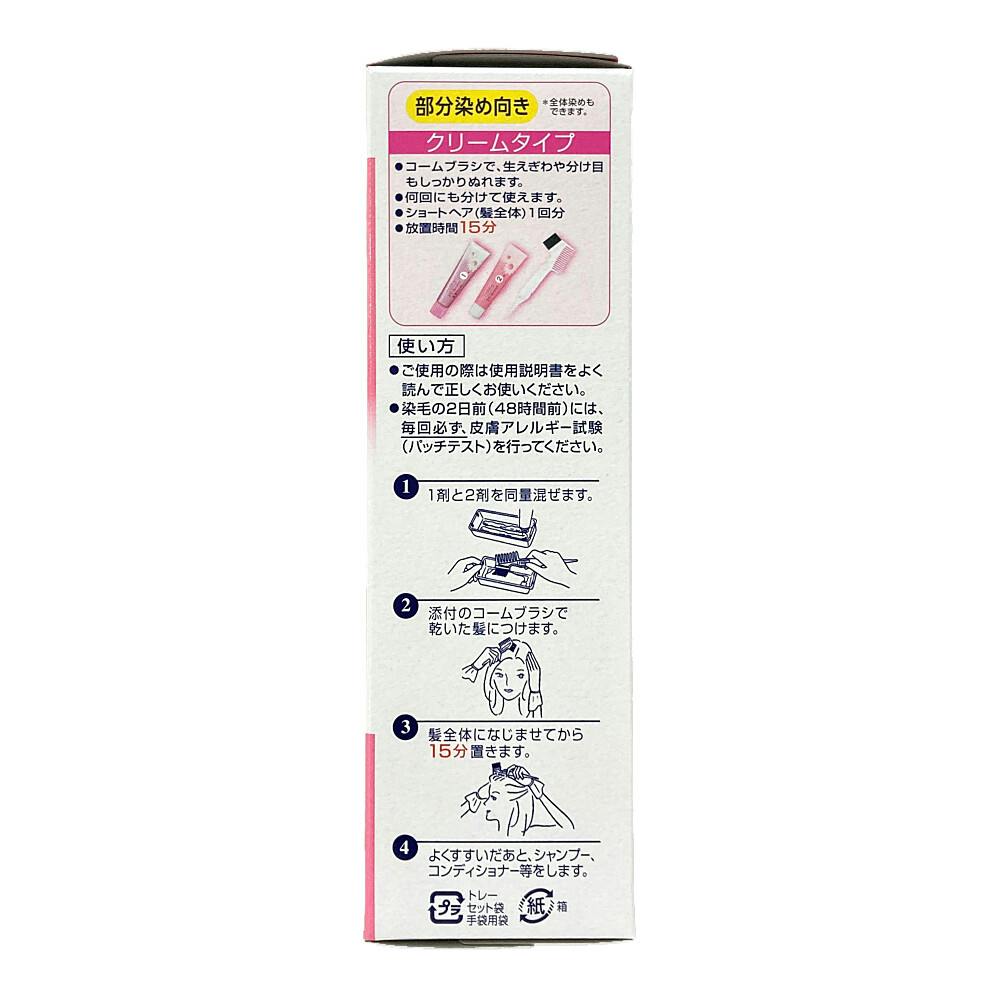 ●部分染めに強いクリームタイプ ●全体染めにも使えます ●染めにくい根元や短い白髪にもしっかり密着するクリーム ●放置時間15分で根元・生えぎわまで深く染まる早染めタイプ