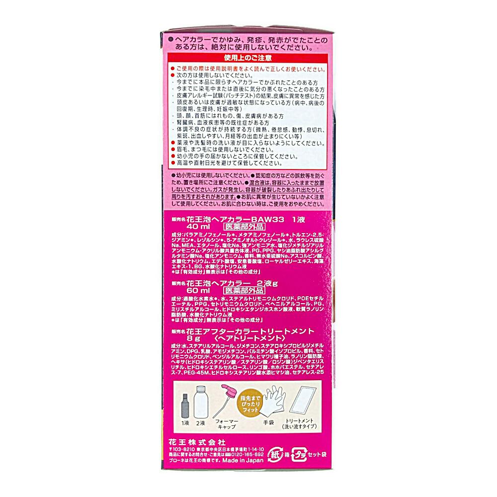 ●花王泡ヘアカラーBAW33・1液:40mL ●花王泡ヘアカラー2液g:60mL ●花王アフターカラートリートメント:8g