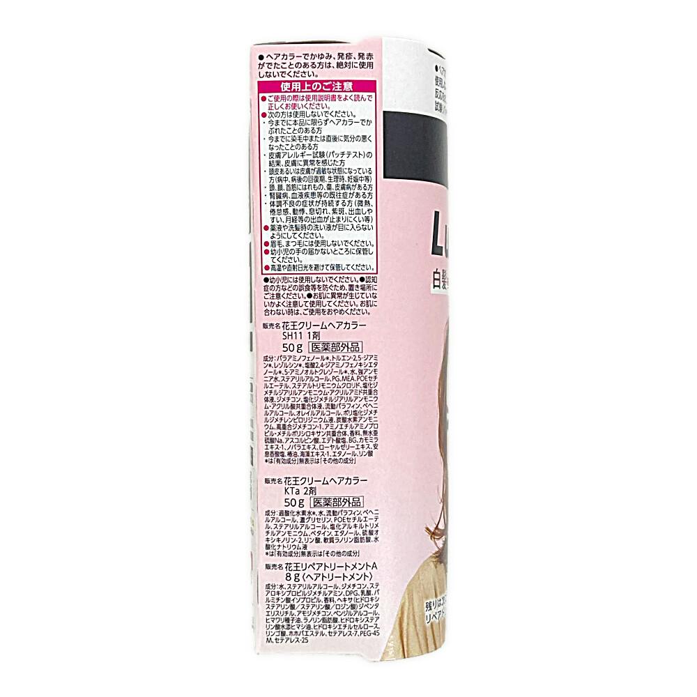 花王クリームヘアカラー SH11 1剤 成分:パラアミノフェノール、トルエン-2,5-ジアミ ン、レゾルシン、塩酸2,4-ジアミノフェノキシエタ ノール、5-アミノオルトクレゾール、水、強アンモニア水、ステアリルアルコール、PG、MEA、POEセチ ルエーテル、他