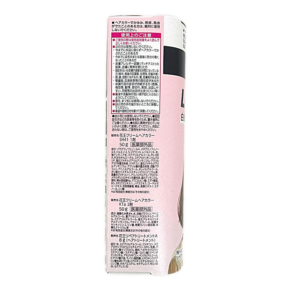 花王クリームヘアカラー SH41 1剤 成分:パラアミノフェノール、メタアミノフェノール、トルエン-2,5-ジアミン、レゾルシン、水、強アンモニア水、ステアリルアルコール、PG、MEA、POEセチルエーテル、ステアルトリモニウムクロ リド、他