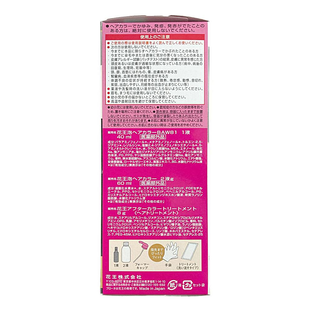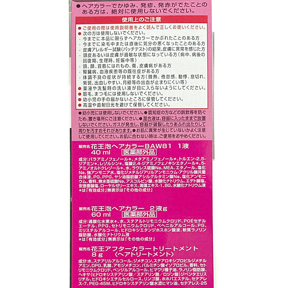 花王泡ヘアカラーBAW81 1液:40mL、花王泡ヘアカラー 2液g:60mL、花王アフターカラートリートメント:8g(ヘアトリートメント)