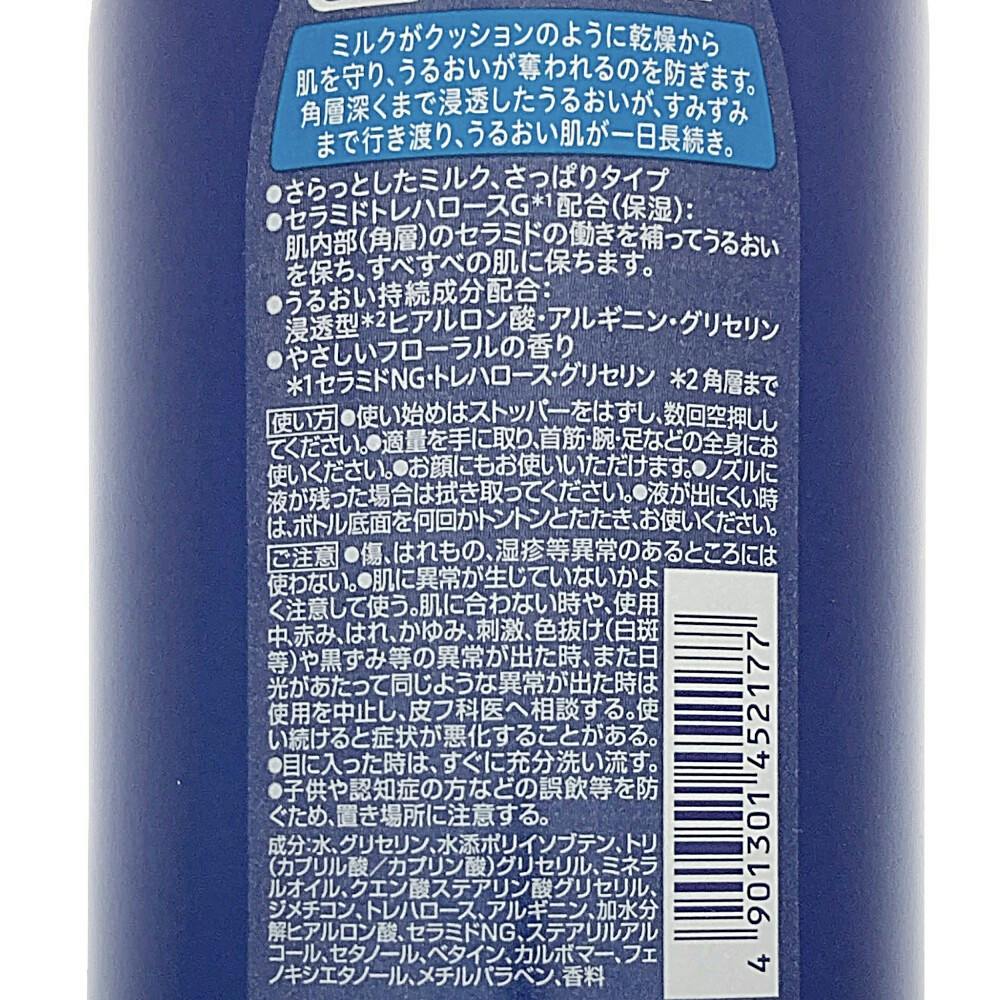 ●さらっとしたミルク、さっぱりタイプ ●セラミドトレハロースG配合(保湿):肌内部(角質)のセラミドの働きを補ってうるおいを保ち、すべすべの肌に保ちます ●うるおい持続成分配合:浸透型ヒアルロン酸・アルギニン・グリセリン など