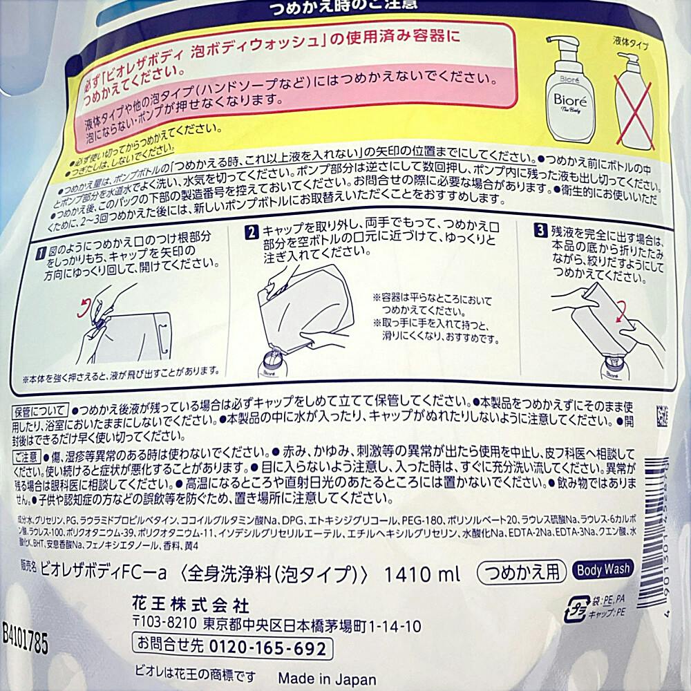 ●必ず「ビオレザボティ泡ボディウォッシュ」の使用済み容器につめかえてください。●液体タイプや他の泡タイプ(ハンドソープなど)にはつめかえないでください。泡にならない・ポンプが押せなくなります。●必ず使い切ってからつめかえてください。など