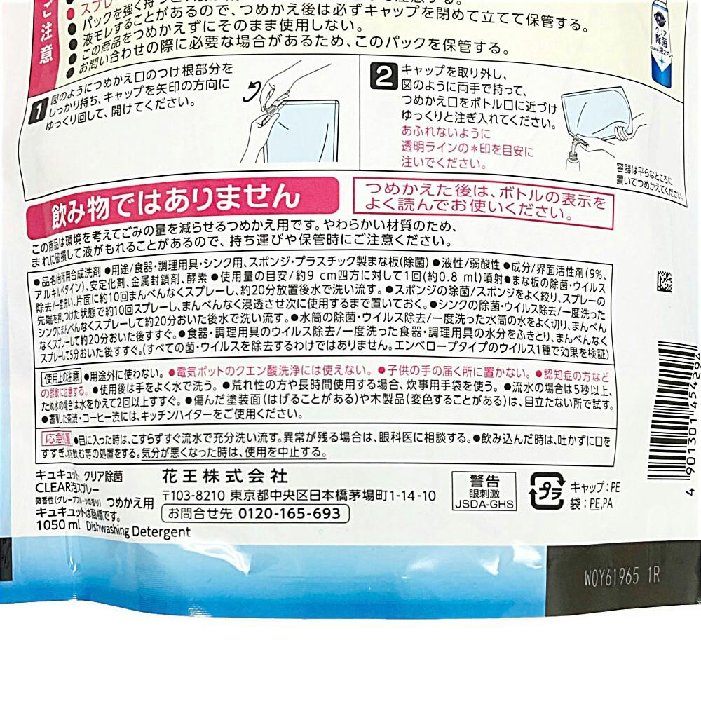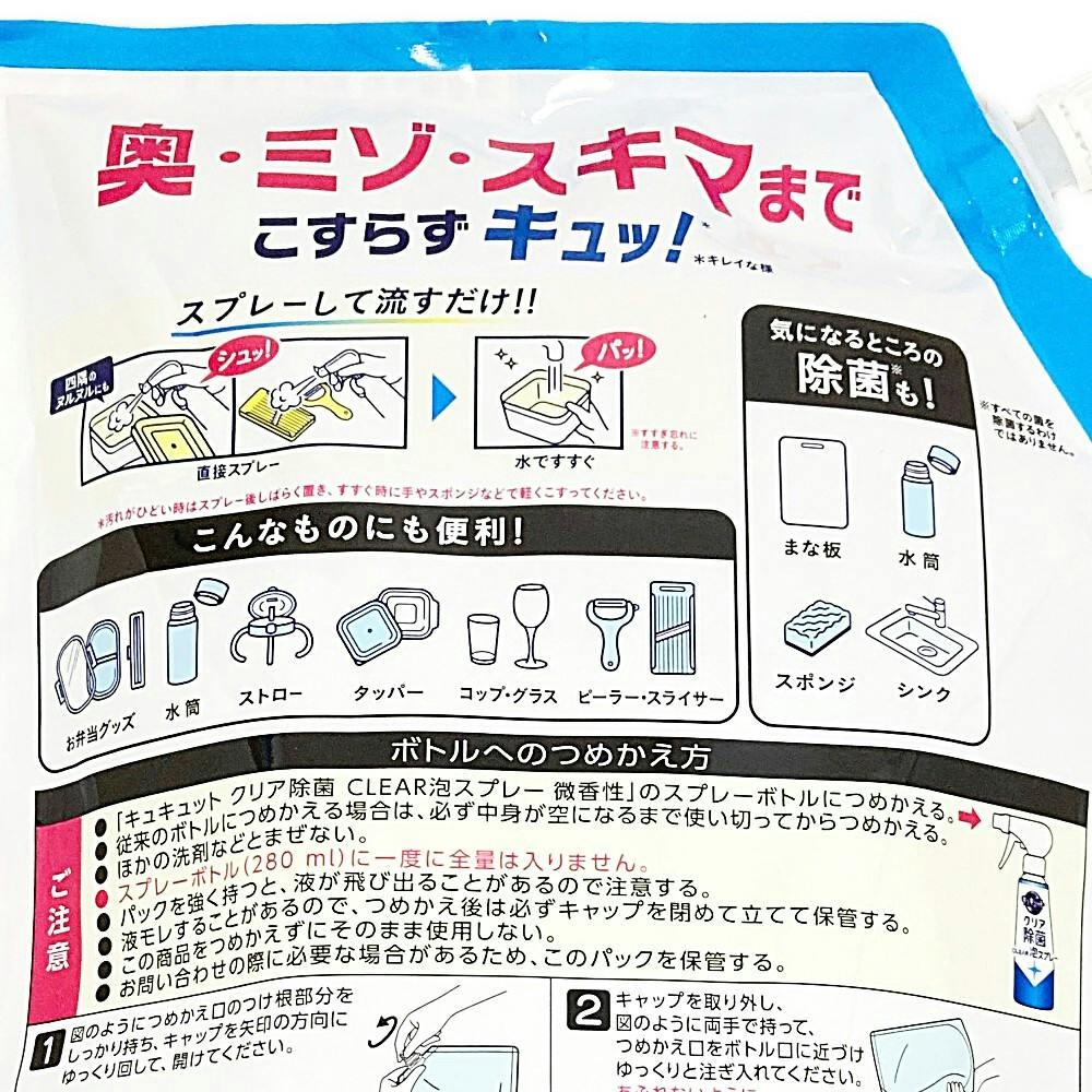 ボトルへのつめかえ方/●「キュキュット クリア除菌 CLEAR泡スプレー 微香性」のスプレーボトルにつめかえる。●従来のボトルにつめかえる場合は、必ず中身が空になるまで使い切ってからつめかえる。●他の洗剤などと混ぜない。など