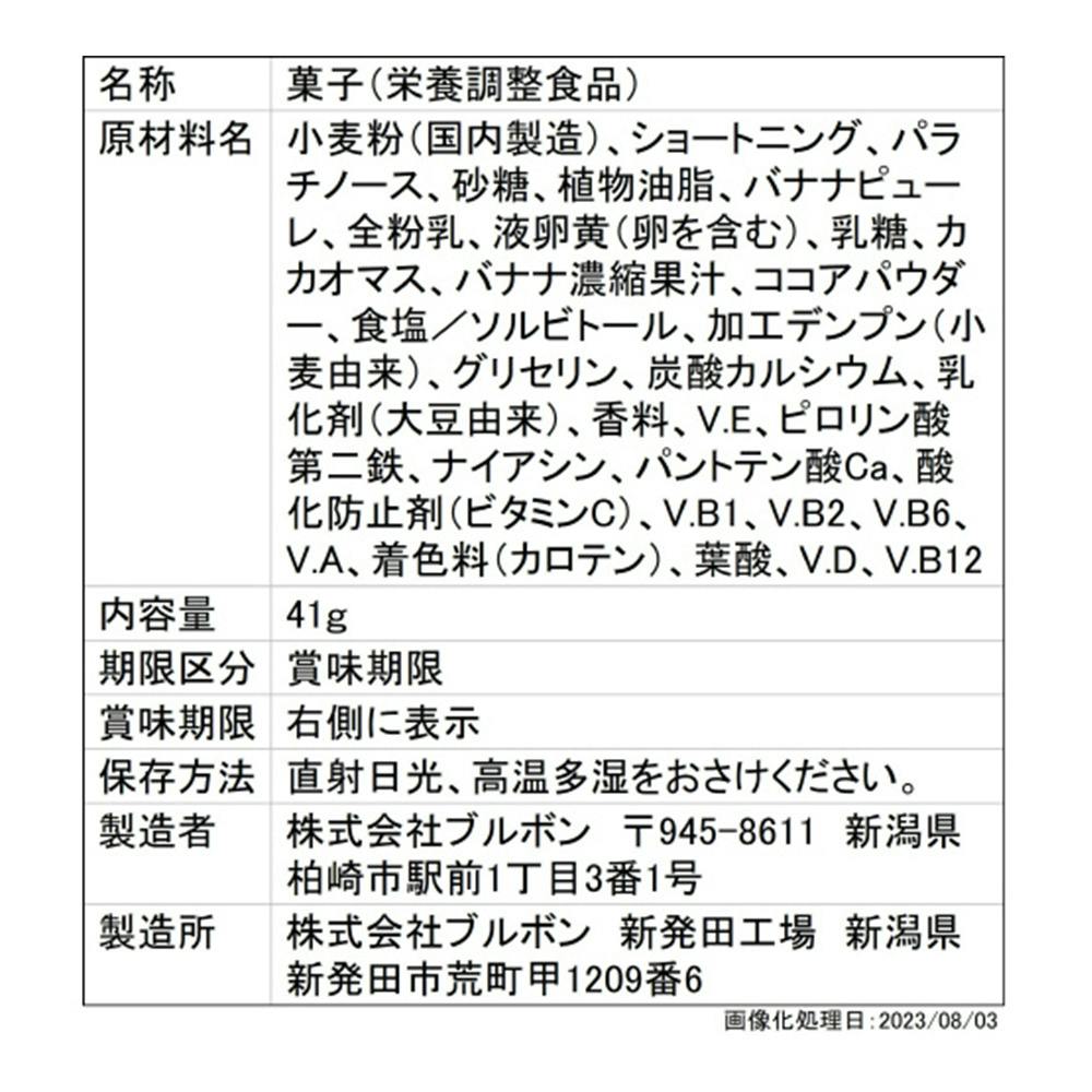 小麦粉(国内製造)、ショートニング、パラチノース、砂糖、植物油脂、バナナピューレ、全粉乳、液卵黄(卵を含む)、乳糖、 カカオマス、バナナ濃縮果汁、ココアパウダー、食塩/ソルビトール、加工デンプン(小麦由来)、グリセリン、炭酸カルシウム、乳化剤(大豆由来)