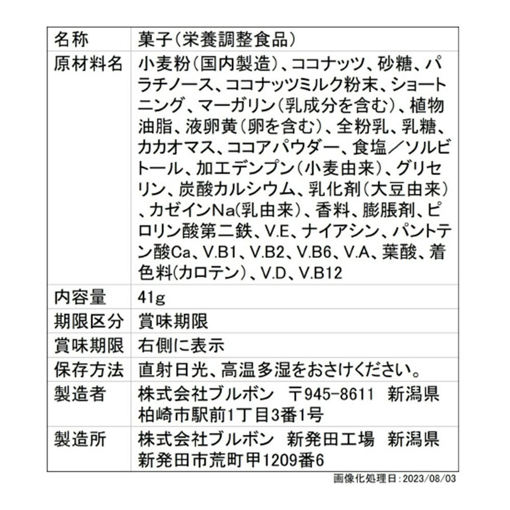 小麦粉(国内製造)、ココナッツ、砂糖、パラチノース、ココナッツミルク粉末、ショートニング、マーガリン(乳成分を含む)、植物油脂、液卵黄(卵を含む)、全粉乳、乳糖、カカオマス、ココアパウダー、食塩/ソルビトール、加工デンプン(小麦由来)、グリセリン、炭酸
