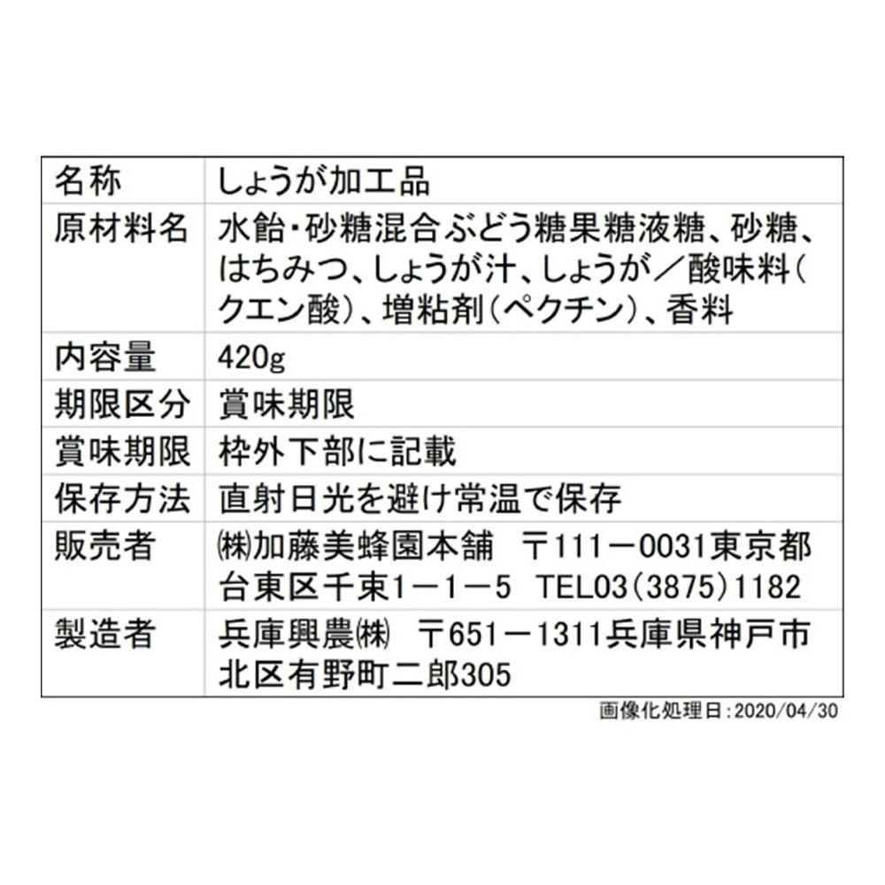 水飴・砂糖混合ぶどう糖果糖液糖(国内製造)、砂糖、はちみつ、しょうが汁、しょうが/酸味料(クエン酸)、増粘剤(ペクチン)、香料