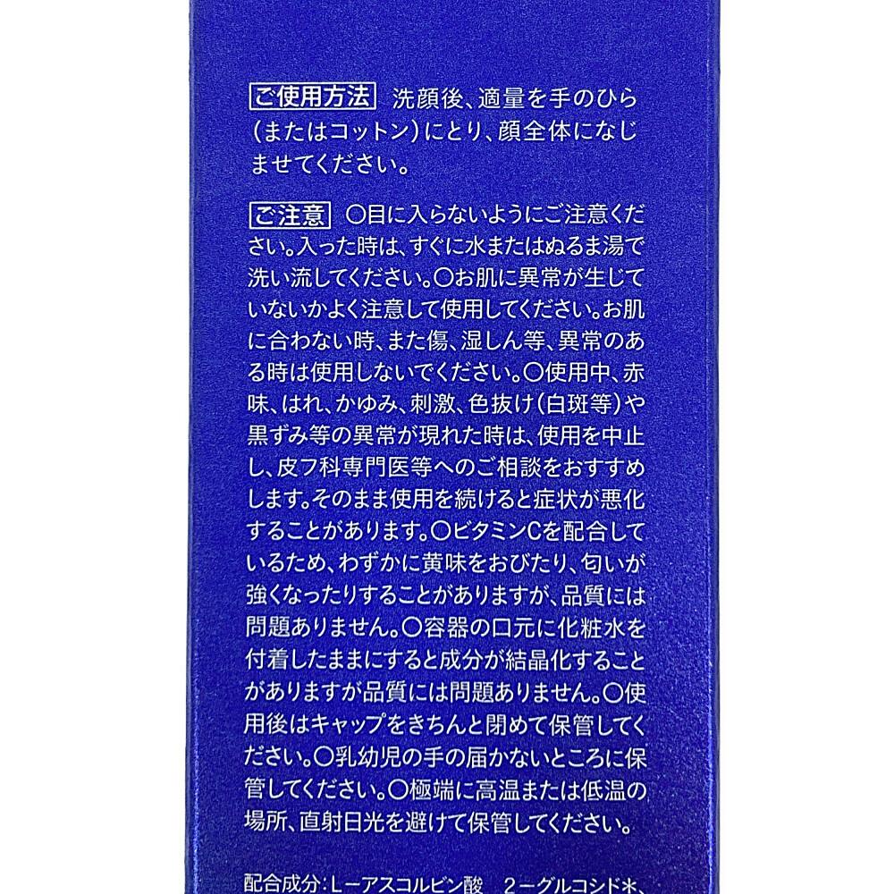 ●高純度ビタミンC/角質層深くまで浸透、メラニンのもとにアプローチ。メラニンの生成を抑え、シミ、そばかすを防ぎます ●トラネキサム酸/乾燥・紫外線などの外部刺激による肌あれを防ぎ、健やかな肌へ ●W有効成分/うるおいMIX(保湿成分)+バランスMIX(整肌成分)