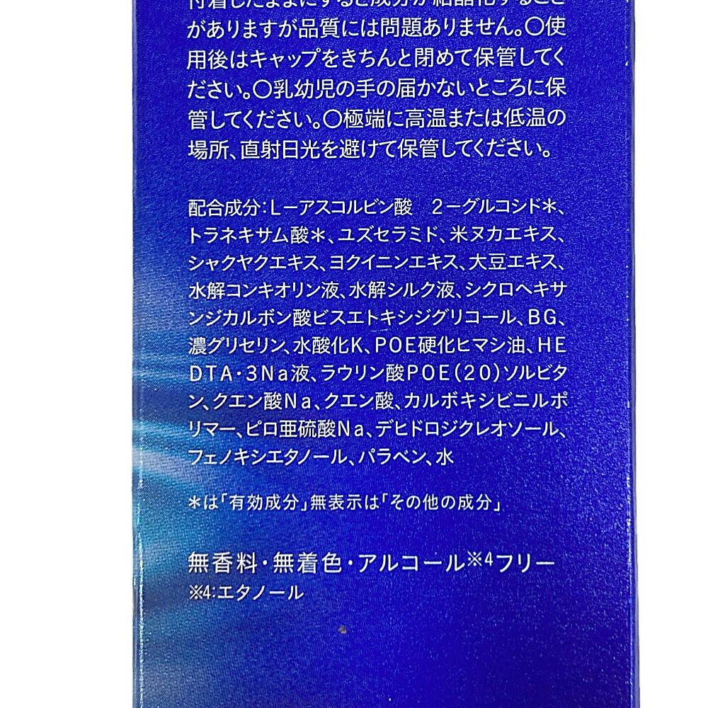 有効成分/2-グルコシド、 トラネキサム酸、その他の成分/L-アスコルビン酸、ユズセラミド、米ヌカエキス、シャクヤクエキス、ヨクイニンエキス、大豆エキス、水解コンキオリン液、水解シルク液、シクロヘキサンジカルボン酸ビスエトキシジグリコール、BG、濃グリセリン、 など