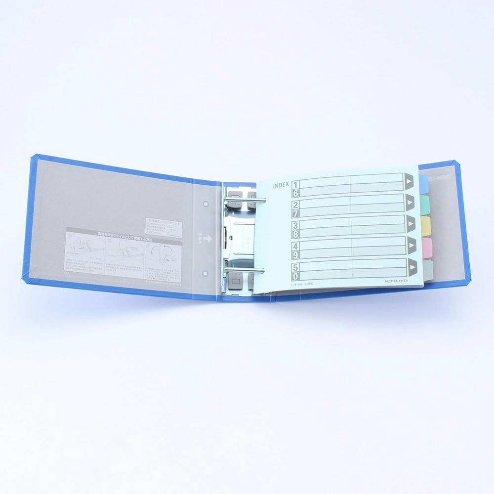 左右の両開き式で大量書類もスムーズに保管。四角マークの色で分類可能。とじ具と表紙の分別廃棄可能