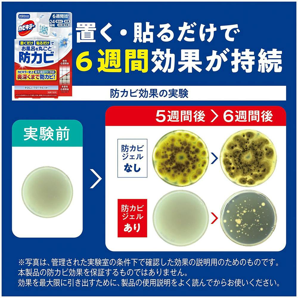 ●カビキラー市場最先端防カビ技術で置く深くまで防カビ。●防カビ効果の高いカラシナの種子から抽出したエッセンシャルオイルを選定。●防カビ成分が24時間常に空気中に補充されるため、6週間しっかり効果が持続。●置くだけ・貼るだけの簡単な使用方法。