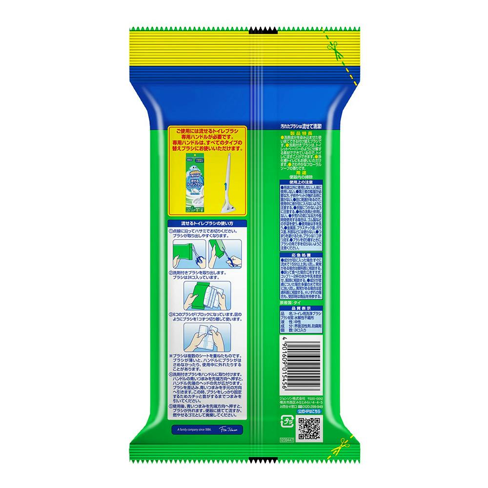 洗剤付きブラシは、トイレットペーパーのように分解する素材でできているので、トイレに流すことができます。濃縮洗剤付ブラシが、フチ裏汚れまでしっかり落とします