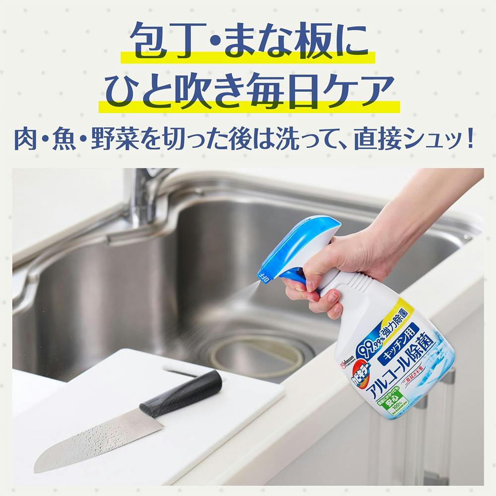 ●台ふきんの除菌、防臭:水洗い後の乾いた台ふきんにスプレーする(10cm×10cm当たり 表裏1回ずつスプレー)。その後の洗い流しは不要。●まな板・包丁・ザル・スライサーなどの調理器具・シンク・水切りカゴの除菌:1.水分を除去する。 2.対象物が濡れる程度にスプレーする。等