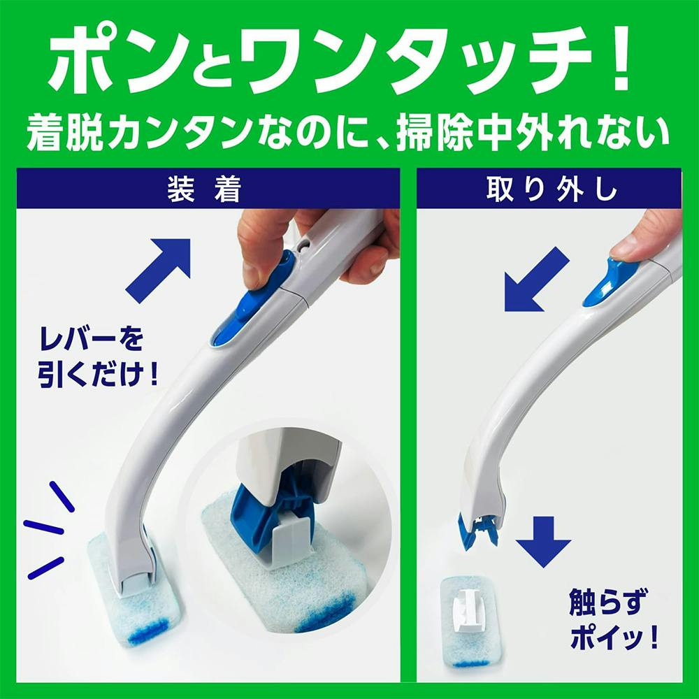1.ブラシハンドルの青いつまみを先端方向へ押すとハンドル先端のヘッドの先が広がります。スポンジ上部の白いパーツを挟み、青いつまみを手元の方へ引きます 2.水たまり部にスポンジを2~3秒浸してから便器内を洗います など