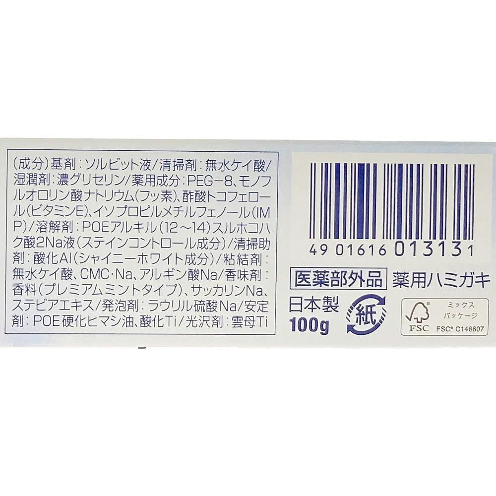 ●基剤:ソルビット液●清掃剤:無水ケイ酸●湿潤剤:濃グリセリン●薬用成分:PEG-8、モノフルオロリン酸ナトリウム(フッ素)、酢酸トコフェロール(ビタミンE)、イソプロピルメチルフェノール(IMP)●溶解剤:POEアルキル(12~14)スルホコハク酸2Na液(ステインコントロール成分) 等