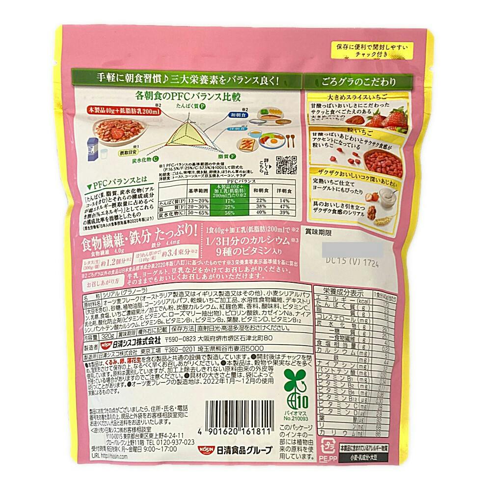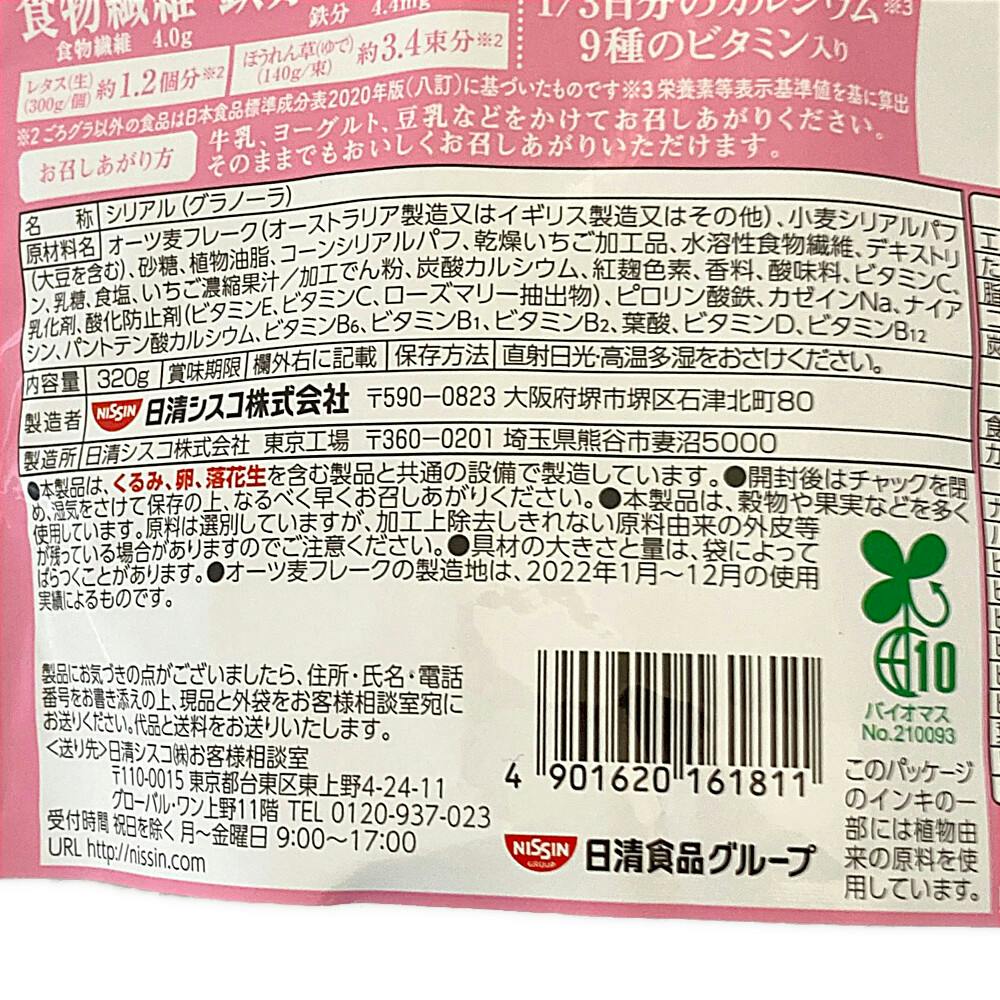 オーツ麦フレーク(オーストラリア製造又はイギリス製造又はその他)、小麦シリアルパフ(大豆を含む)、砂糖、植物油脂、コーンシリアルパフ、乾燥いちご加工品、水溶性食物繊維、デキストリン、乳糖、食塩、いちご濃縮果汁/加工でん粉、等