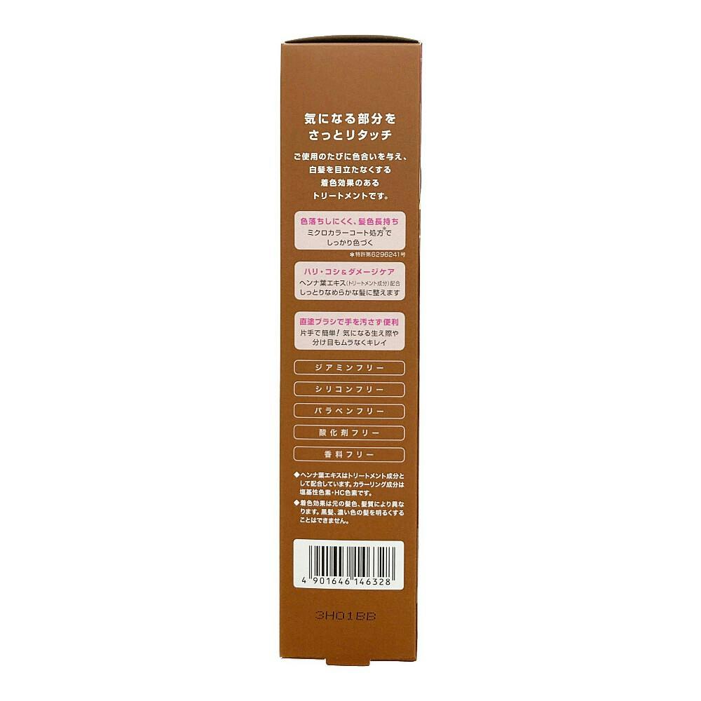 ●気になる部分をさっとリタッチ ●ご使用のたびに色合いを与え、白髪を目立たなくする着色効果のあるトリートメントです ●色落ちしにくく、髪色長持ち ●ハリ・コシ&ダメージケア ●直塗ブラシで手を汚さず便利