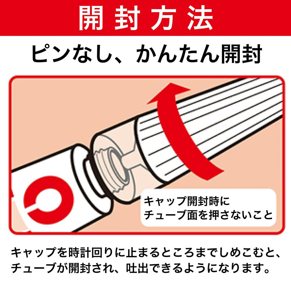 "【開封の仕方】 1.キャップを時計回りに止まるところまでしめこむとチューブが開封され、吐出できるようになります。 2.キャップを反時計回りに回すと開きます。"