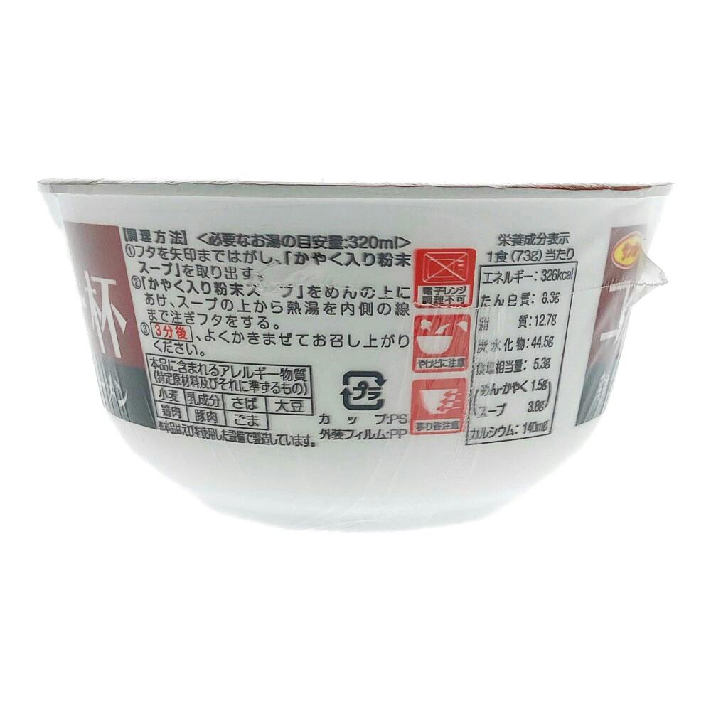 1食(73g)当たり/エネルギー:326kcal、たん白質:8.3g、脂質:12.7g、炭水化物:44.5g、食塩相当量:5.3g(めん・かやく:1.5g、スープ:3.8g)、カルシウム:140mg