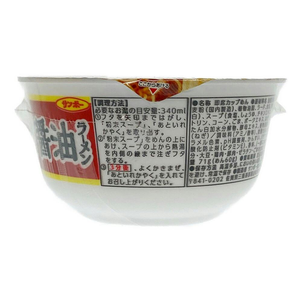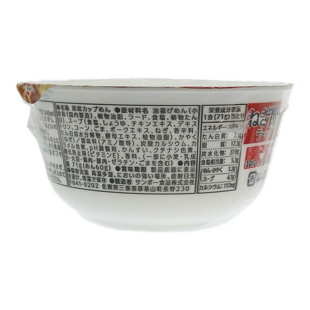 油揚げめん(小麦粉(国内製造)、植物油脂、ラード、食塩、植物たん白)、スープ(食塩、しょうゆ、チキンエキス、デキストリン、コーン、ごま、ポークエキス、ねぎ、香辛料、たん白加水分解物、酵母エキス、植物油脂)、かやく(ねぎ)/調味料(アミノ酸等)、など