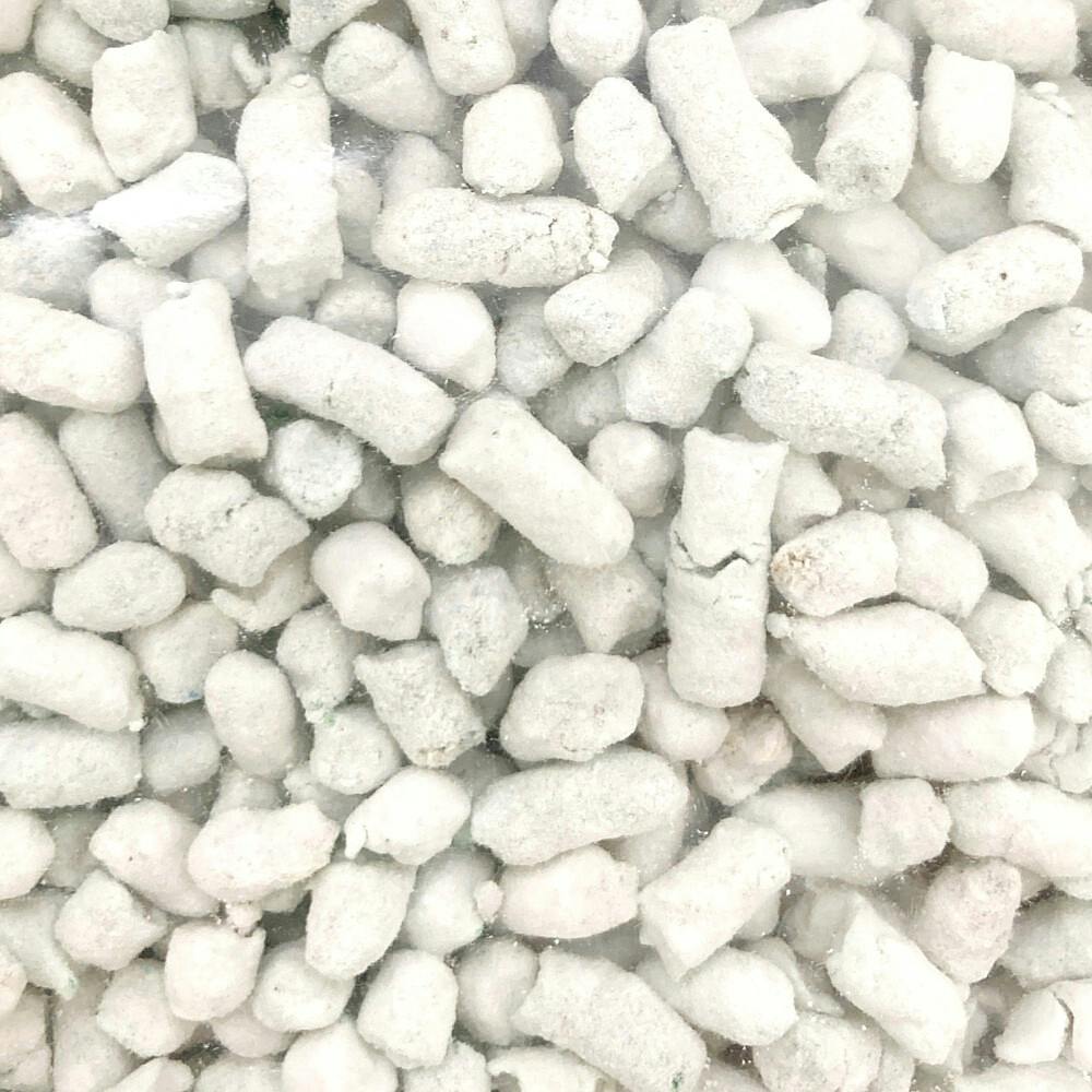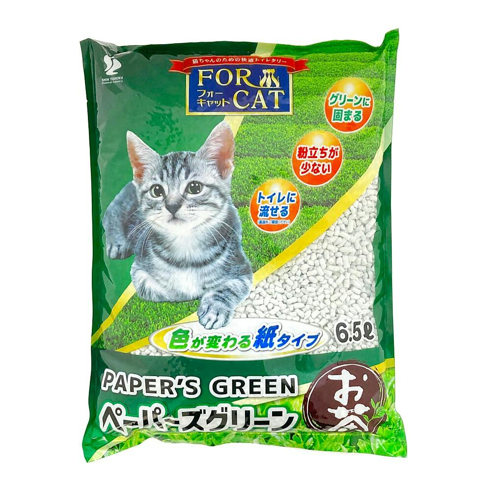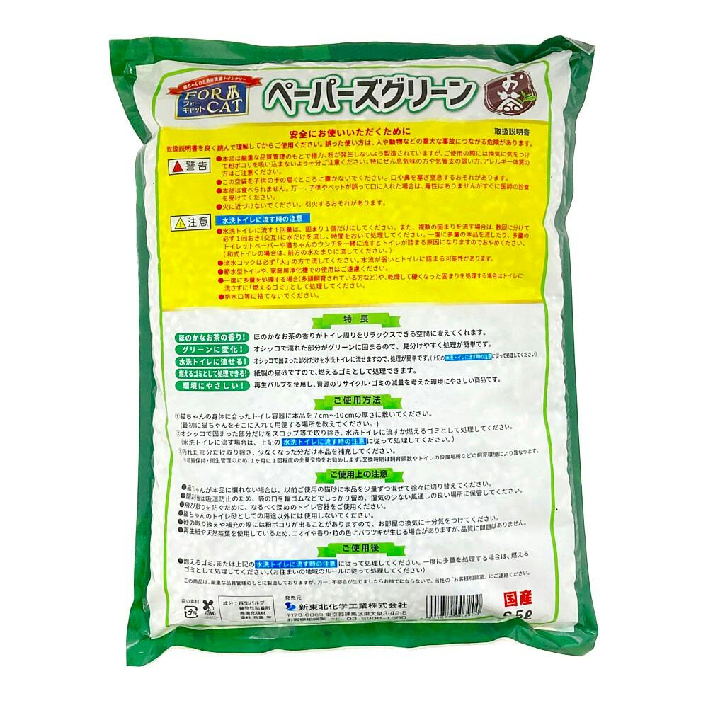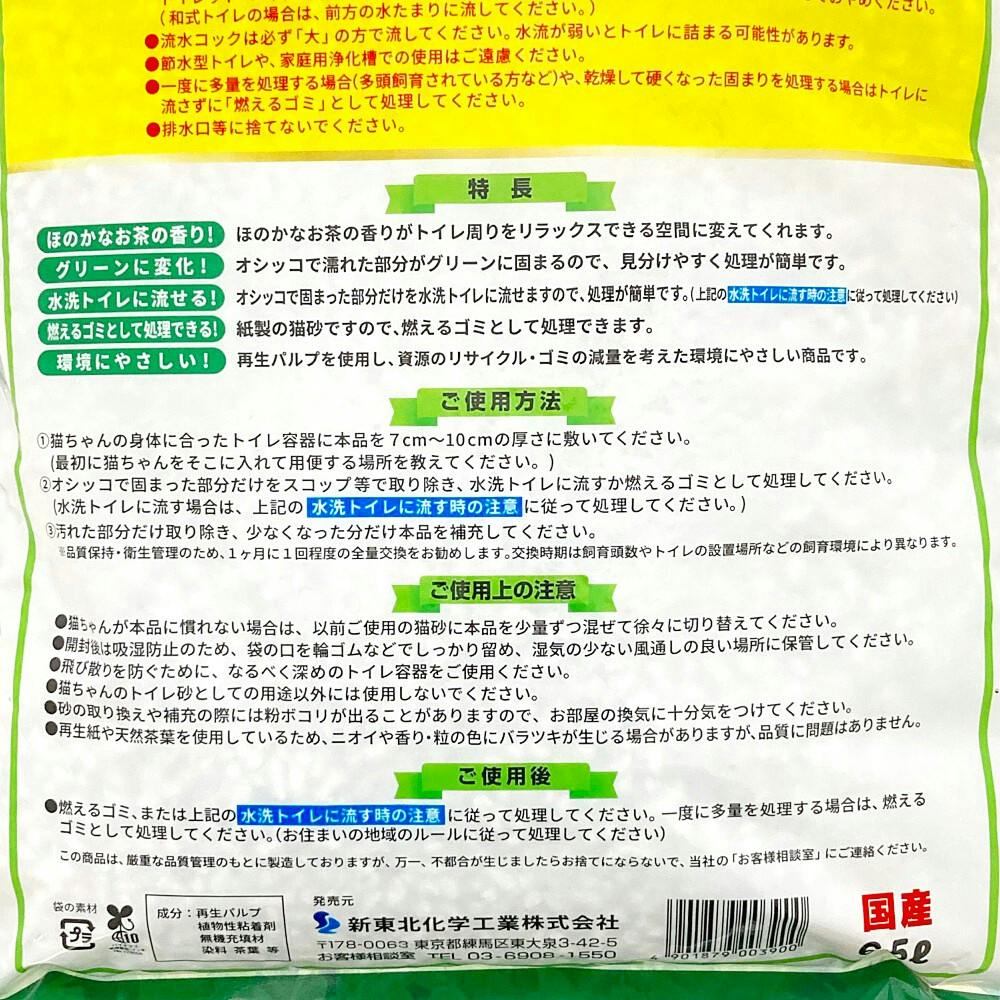 オシッコでぬれた部分がグリーンに固まるお掃除サイン付きの紙製猫砂。オシッコで汚れた部分が一目でわかるので処理がとても簡単です。天然茶葉使用でほのかなお茶の香りがします。