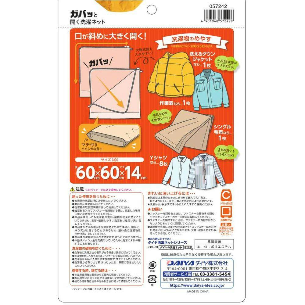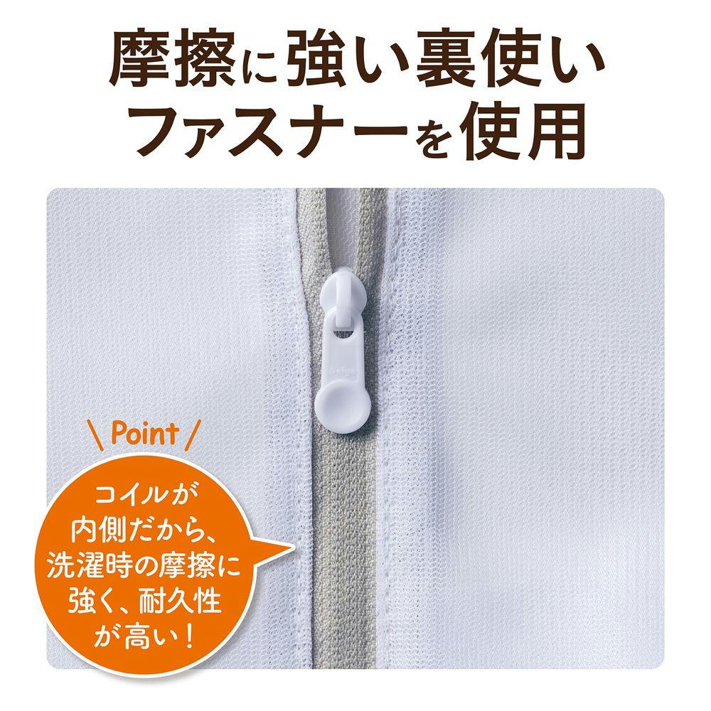 ファスナーが斜めに大きくガバッと大きく開くので、洗えるダウンジャケットなどかさばる衣類の出し入れがしやすい洗濯ネットです。