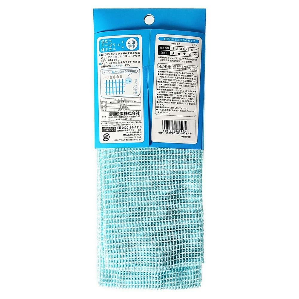 100%のメッシュ編みで適度な肌ざわりでさっぱりした洗い上がりのボディタオルです。