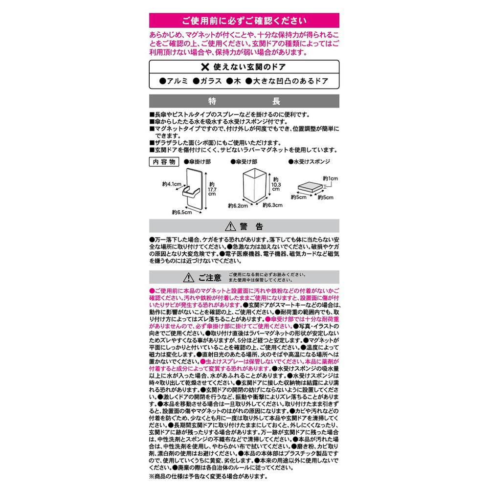 ●長傘やピストルタイプのスプレーなどを掛けるのに便利です。●傘からしたたる水を吸水する水受けスポンジ付です。●マグネットタイプですので、付け外しが何度でもでき、位置調整が簡単にできます。