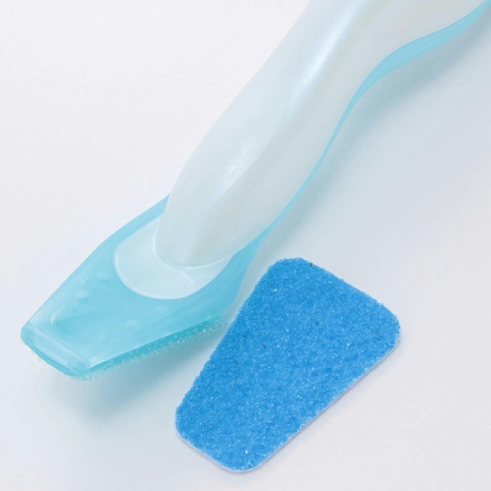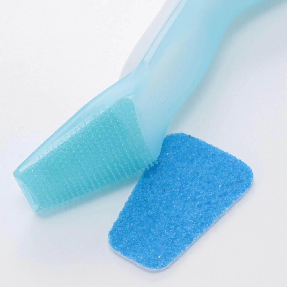 シートの白い面をスティックの面ファスナー部分につけ、先端のくぼみに人差し指をそえて握り、こすります。