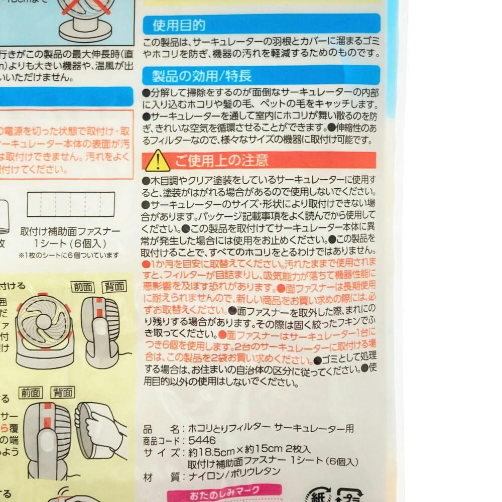 ●サーキュレーター用 ●分解して掃除をするのが面倒なサーキュレーターの内部に入り込むホコリや髪の毛、ペットの毛をキャッチします ●サーキュレーターを通して室内にホコリが舞い散るのを防ぎ、きれいな空気を循環させることができます