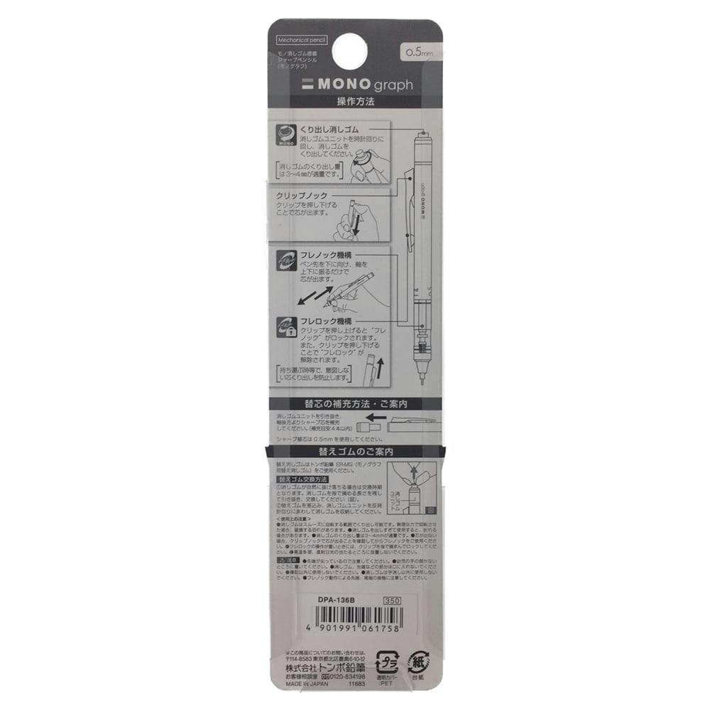 ●「繰り出し式消しゴム」しっかり消せるモノ品質の消しゴムを搭載。 ●「固定パイプ式のペン先」安定した精密な筆記が可能。 ●「フレノック機構」軸を上下に振るだけで芯が出ます。