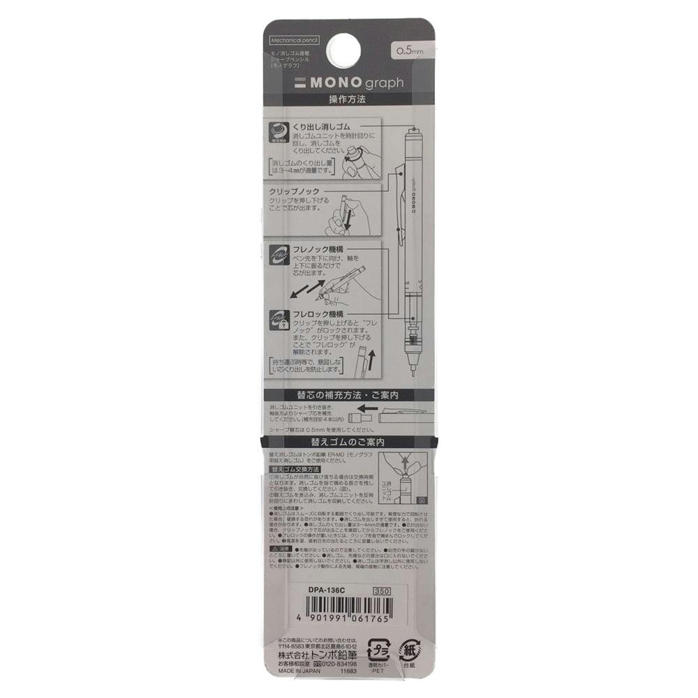 ●「繰り出し式消しゴム」しっかり消せるモノ品質の消しゴムを搭載。 ●「固定パイプ式のペン先」安定した精密な筆記が可能。 ●「フレノック機構」軸を上下に振るだけで芯が出ます。
