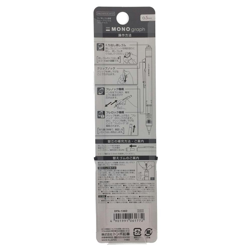 ●「繰り出し式消しゴム」しっかり消せるモノ品質の消しゴムを搭載。 ●「固定パイプ式のペン先」安定した精密な筆記が可能。 ●「フレノック機構」軸を上下に振るだけで芯が出ます。