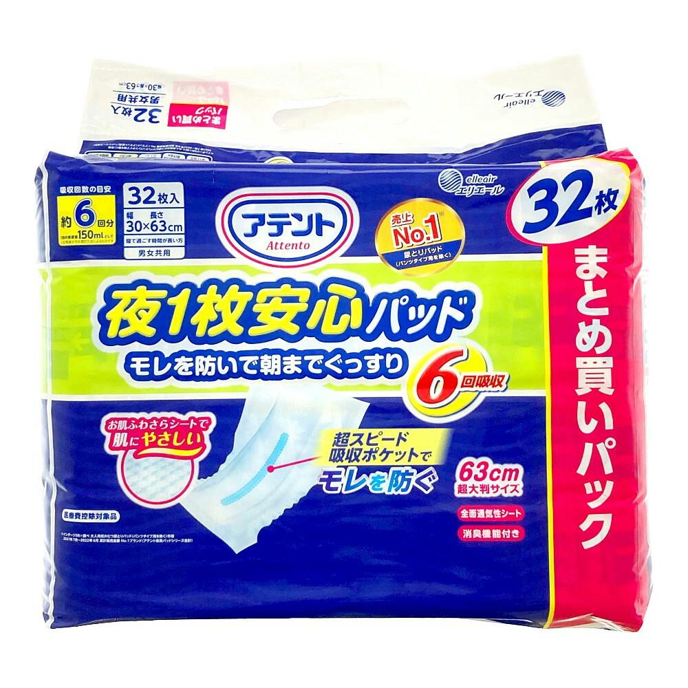 アテント 夜1枚安心パッド 仰向け・横向き寝でもモレを防ぐ 約6回吸収 まとめ買いパック 32枚 医療費控除対象商品