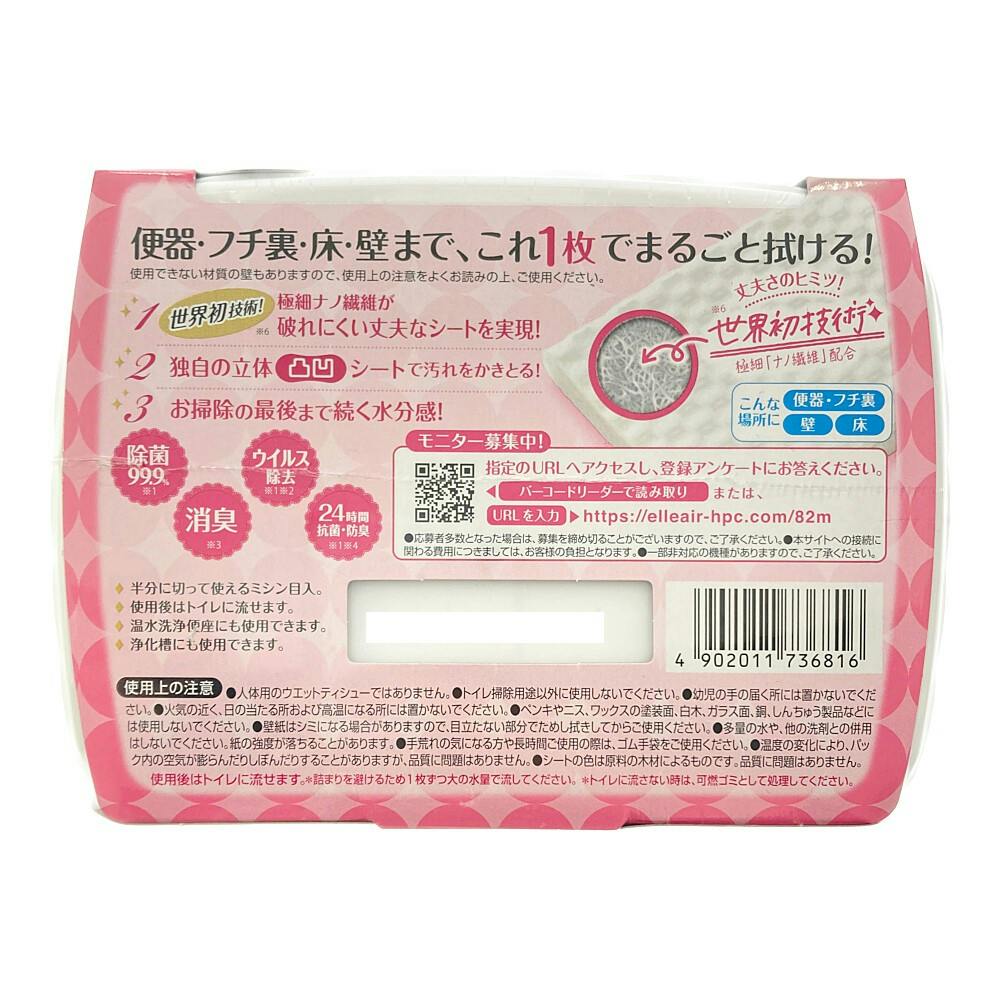 ●便器・フチ裏・床・壁まで、これ1枚でまるごと拭ける! ●極細ナノ繊維が破れにくい丈夫なシートを実現! ●独自の立体凸凹シートで汚れをかきとる! ●お掃除の最後まで続く水分感!