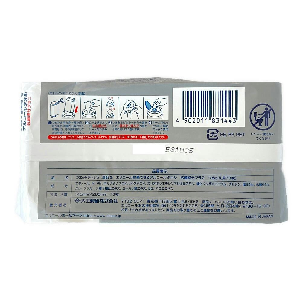 大王製紙 エリエール 除菌できるアルコールタオル 抗菌成分プラス 詰替 70枚
