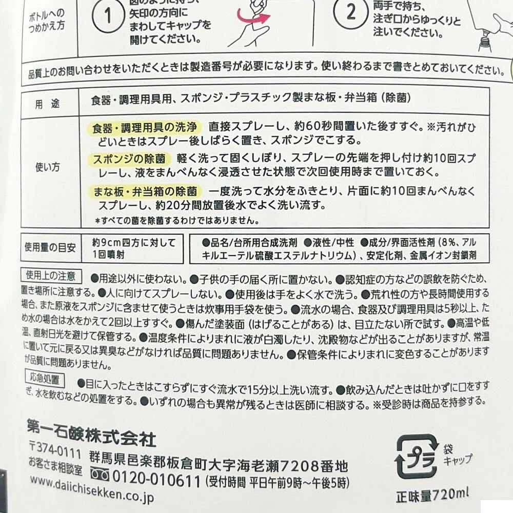 ●使用量の目安:約9cm四方に対して1回噴射 ●食器・調理用具の洗浄/直接スプレーし、約60秒間置いた後すすぐ。●スポンジ除菌/軽く洗って固くしぼり、スプレーの先端を押し付け約10回スプレーし、液をまんべんなく浸透させた状態で次回使用時まで置いておく。など