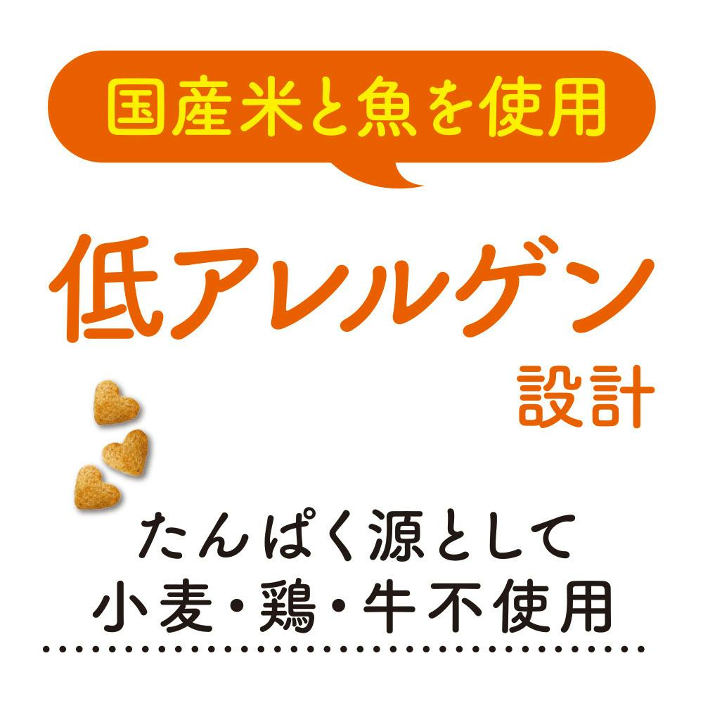 食物アレルギーに配慮し、国産米と魚を使用。DHA・EPA配合で健康を保ち、皮膚のバリア機能維持。