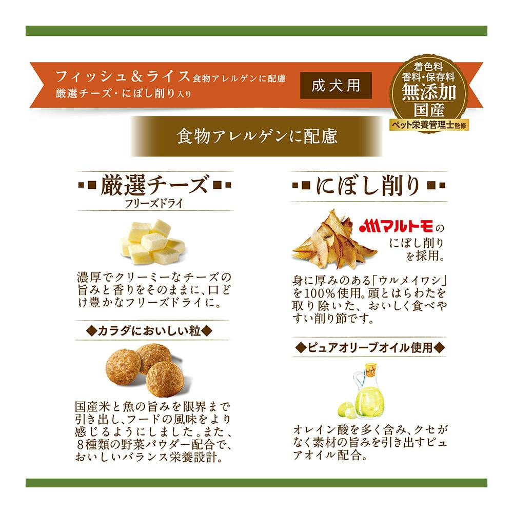 食物アレルゲンに配慮し、国産米と魚を使用。素材のおいしさと栄養がとれる、厳選チーズとにぼし削り入り