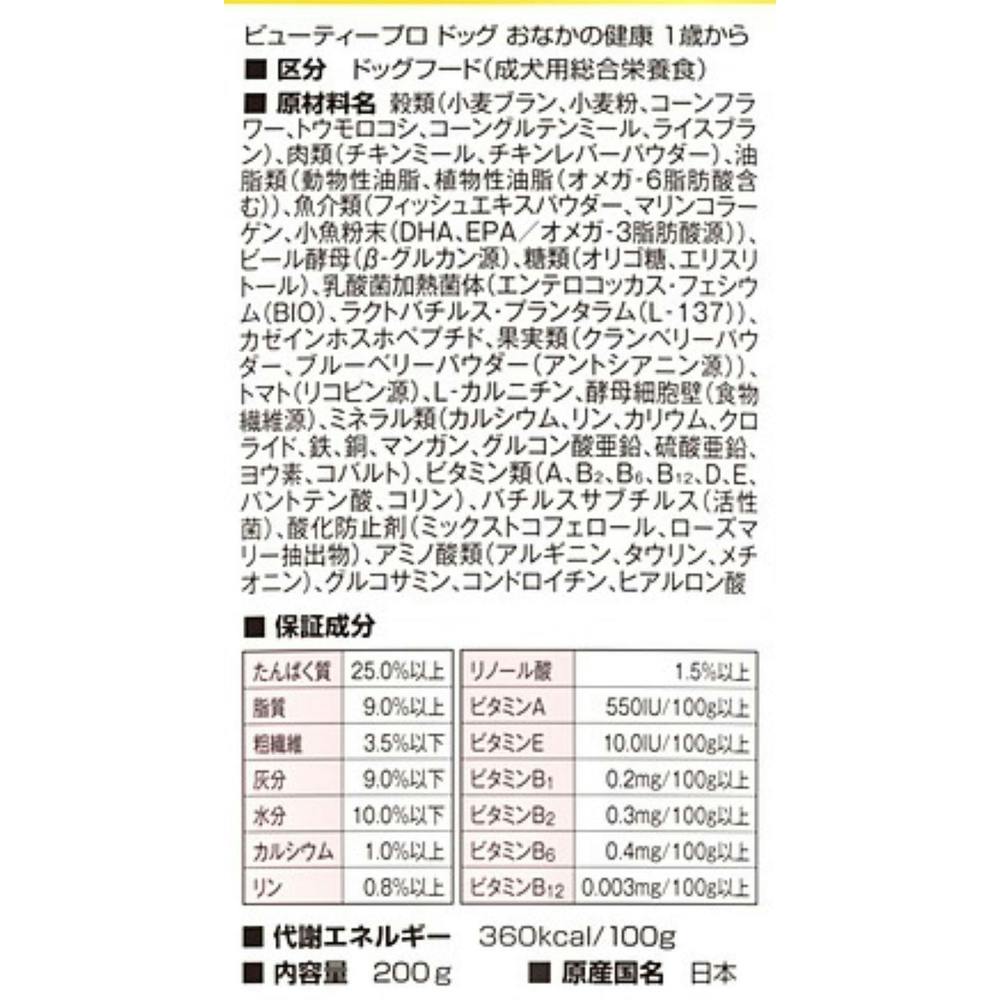穀類(小麦ブラン、小麦粉、コーンフラワー、トウモロコシ、コーングルテンミール、ライスブラン)、肉類(チキンミール、チキンレバーパウダー)、油脂類(動物性油脂、植物性油脂(オメガー6脂肪酸含む))、魚介類(フィッシュエキスパウダー、マリンコラーゲン、小魚粉末