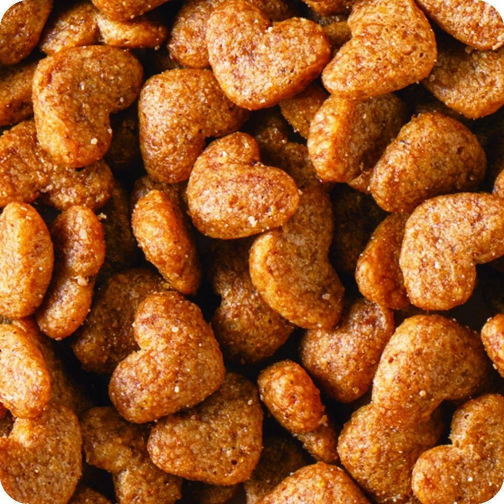 穀類(トウモロコシ、小麦粉、コーングルテンミール、パン粉)、肉類(牛肉粉、豚肉粉)、油脂類(動物性油脂、植物性油脂)、フィッシュパウダー、オリゴ糖、アップルファイバー(セラミド源)、海藻粉末(DHA源)、乳酸菌加熱菌体、GABA、ほか